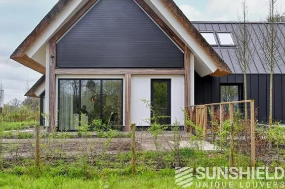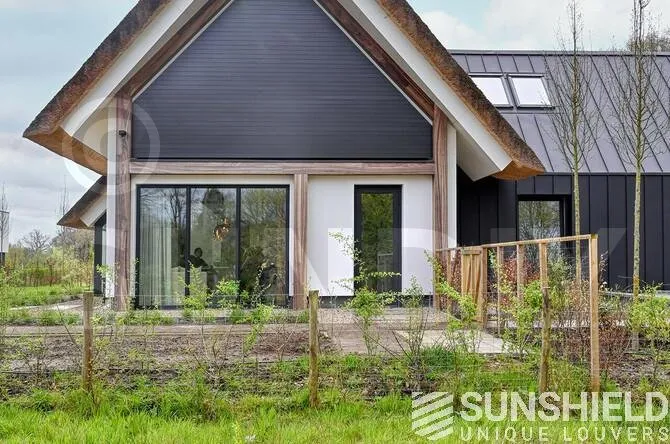 Au-dessus de la porte d’entrée de la façade sud, une combinaison de deux systèmes de persiennes a été installée. La lucarne sur le toit s’intègre harmonieusement avec le système de persiennes de l’entrée.