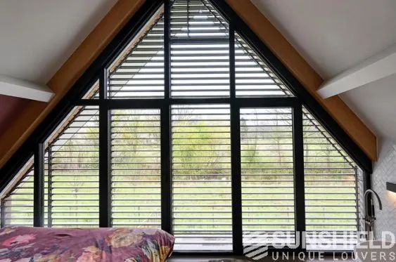 La fenêtre du premier étage de la façade est équipée d’un système de lamelles inclinables couvrant 16 m². Le design commence par un rectangle à la base, se transformant en triangle après environ un mètre.