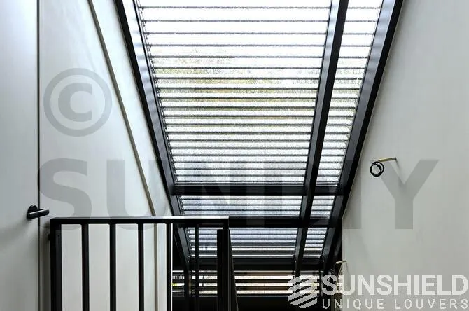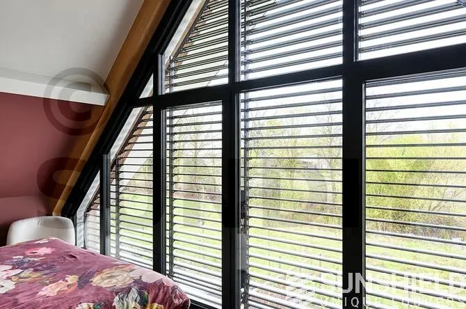 La partie inférieure rectangulaire mesure 640 mm de hauteur, avec des lames fixes inclinées à 45°. Les autres systèmes de persiennes sont motorisés et leur ouverture et fermeture sont contrôlées centralement via la domotique.