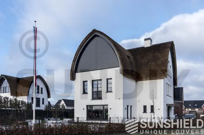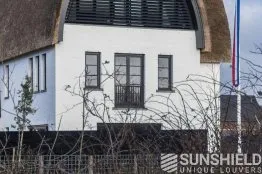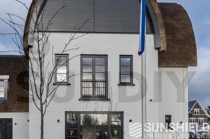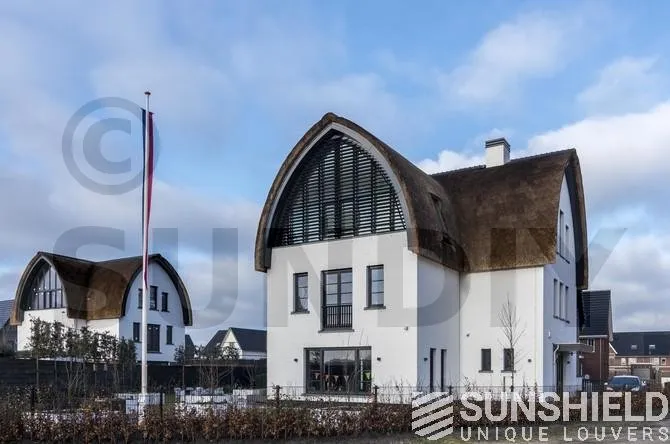 Sunshield a résolu ce problème grâce à un système de persiennes sur mesure. La forme incurvée ne pose aucun problème. La surface totale du store mobile est de près de 22 m², actionné par deux moteurs.