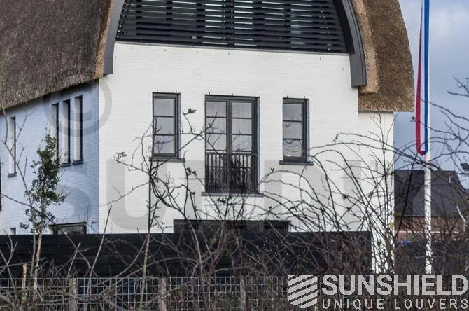 Pour cette protection solaire, les propriétaires ont opté pour la persienne 150-E. Les pièces en aluminium sont revêtues de RAL 7021 (gris noir) avec un degré de brillance de 30 %. Les pièces en plastique moulées par injection sont noires.