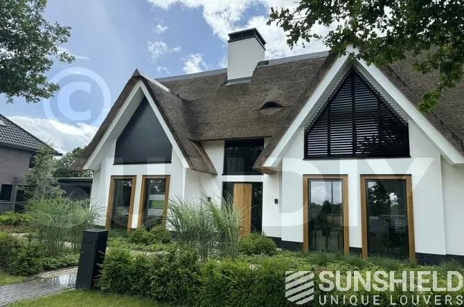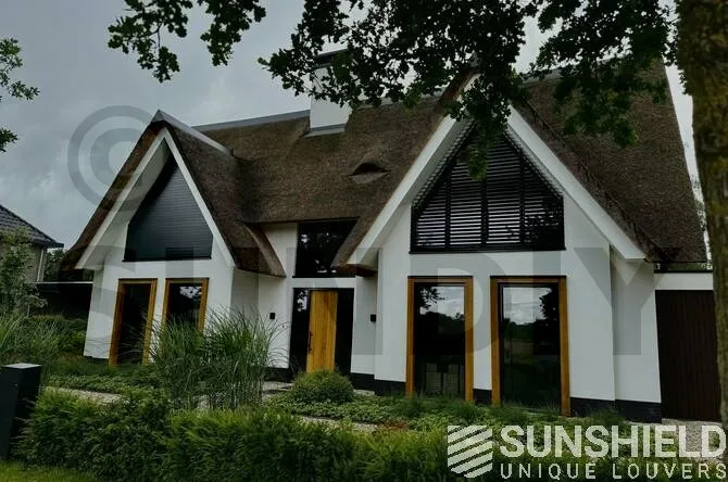 Deux systèmes de persiennes identiques sont installés en façade. Ils commencent sous forme de rectangle à la base et se transforment rapidement en triangle. Chaque store mesure 3,40 mètres de haut et de large.