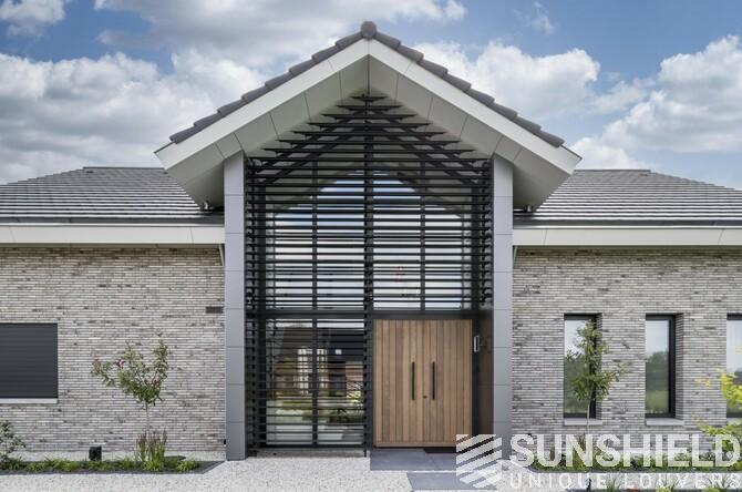A l’entrée de la maison, un système de lamelles a été installé sur la porte d’entrée. Ce système est placé à environ 75 cm devant la façade. Cela a créé un vestibule entre les stores pare-soleil et la façade vitrée. Les résidents ont ici opté pour la persienne 150-E.