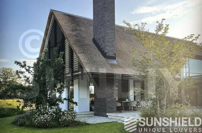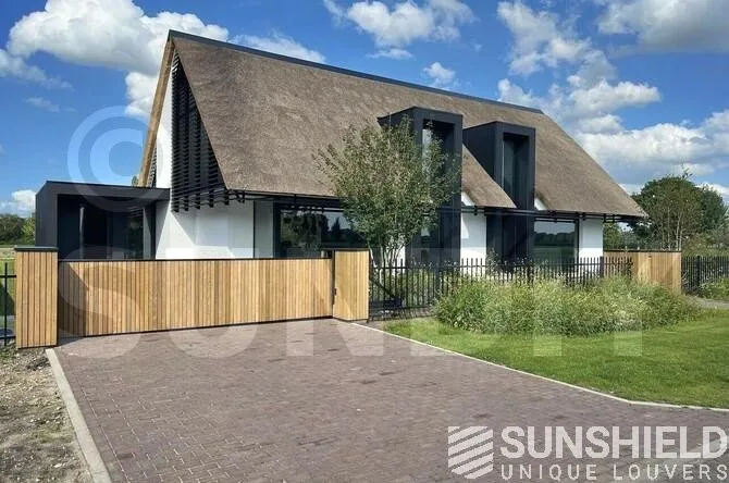 Sur le côté gauche de la villa, deux systèmes de lamelles ont été placés. Tout d’abord, un polygone qui ressemble à un triangle mais avec la pointe légèrement placée vers l’intérieur. Ce système de persiennes fonctionne également sans fil. Un excellent exemple que Sunshield propose des persiennes mobiles de toutes formes.