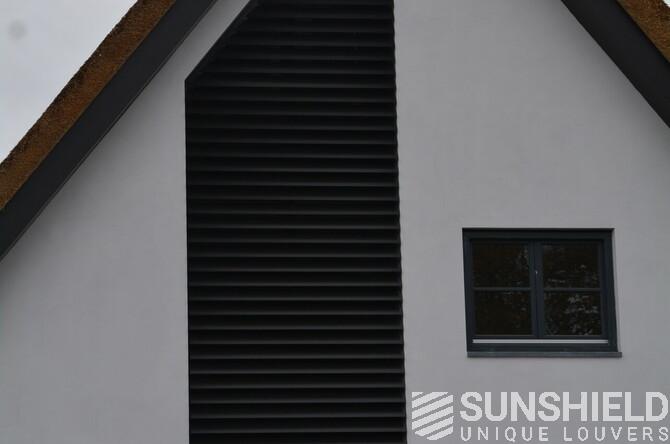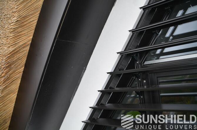 Voici une résidence dotée de persiennes uniques de Sunshield. Un système de lames à persiennes inclinables a été installé sur les façades avant et arrière.