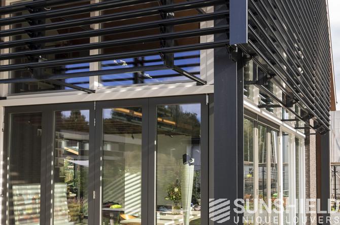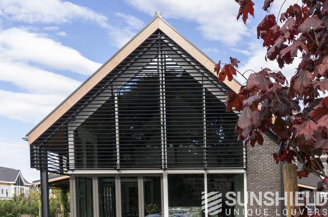 Ce système est particulièrement unique car les lames sont montées sur des chevrons. La protection solaire est ainsi légèrement éloignée du mur.