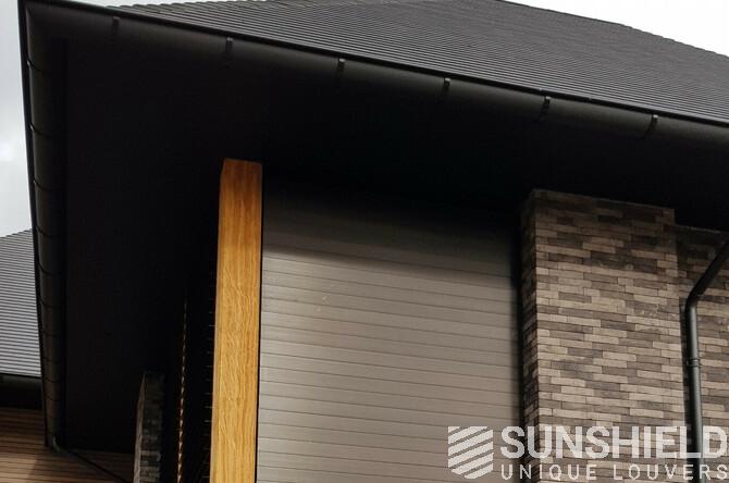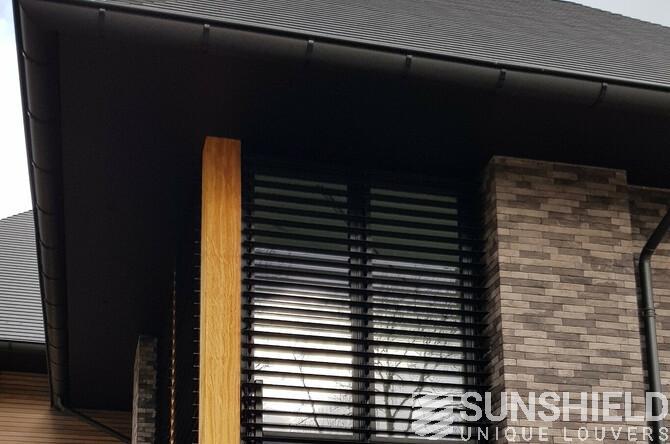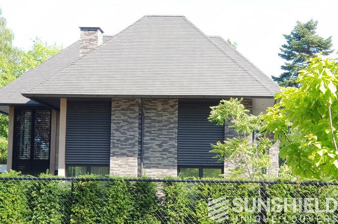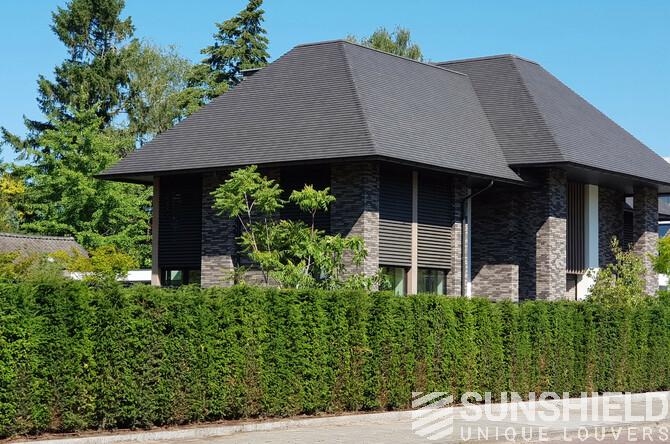 Les propriétaires ont choisi la persienne 96-E, une lame à la forme épurée. Ces persiennes sont d’abord brossées puis anodisées en Alubronze 04. Les autres pièces en aluminium sont revêtues de RAL 9005. Lors du revêtement, une fine structure est ajoutée à la poudre RAL. Cela donne aux pièces revêtues un fin relief.