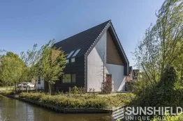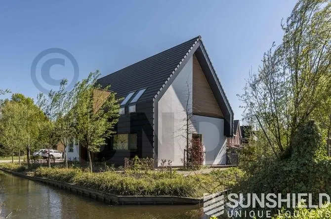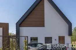 Les systèmes de façade avant et arrière sont de forme triangulaire. Un système de lamelles rectangulaires a été placé dans le mur latéral, au-dessus de la porte d’entrée. Les systèmes sont motorisés et fonctionnent indépendamment les uns des autres.