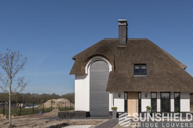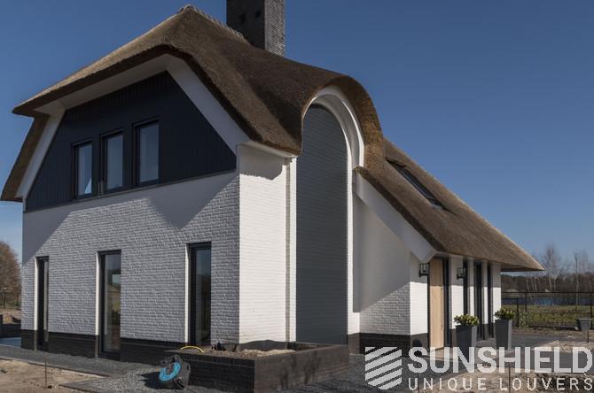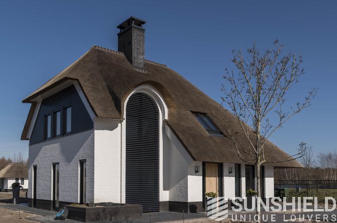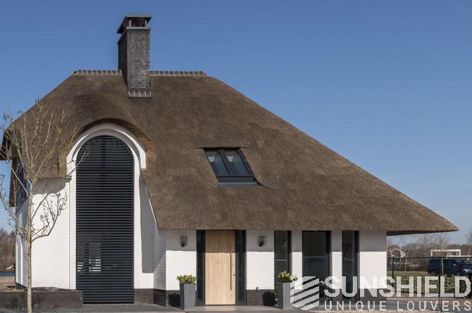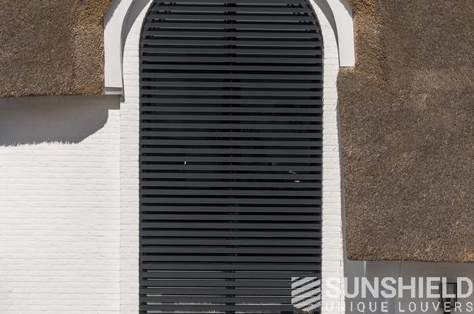 Sunshield a équipé cette fenêtre cintrée d’un store. Ce système de lames a une surface de près de 12 m². Les propriétaires ont opté pour la lame 96-E. Cette lame a une largeur de 96 mm. Les résidents actionnent les lames avec une télécommande, en continu dans n’importe quelle position souhaitée entre 0 et 90°.