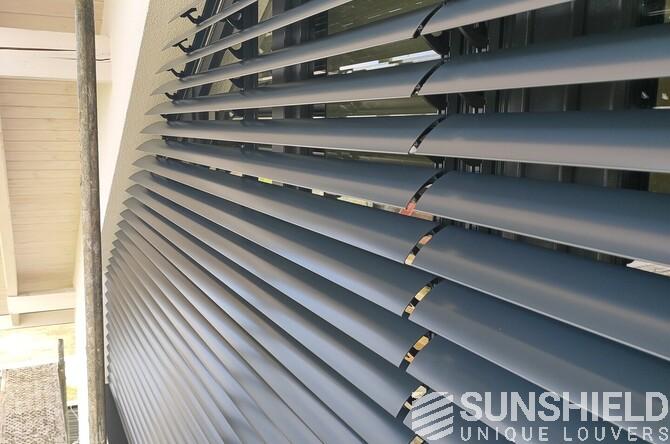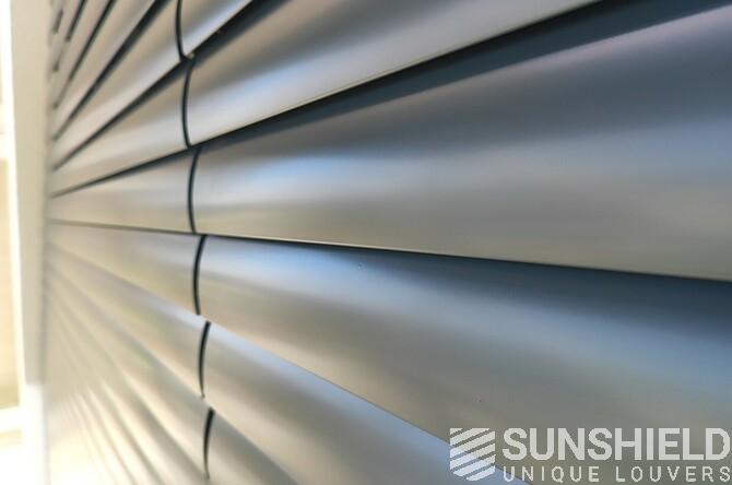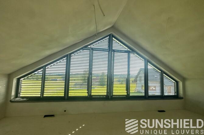 Les propriétaires ont opté pour la persienne 75-E. Une lame de forme arrondie et d’une largeur de 75 mm. Lorsque les lames sont entièrement ouvertes, la vue entre les lames est de 70 mm.