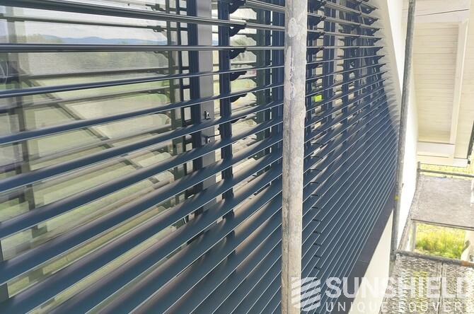 Au premier étage, un store pare-soleil à lamelles horizontales mobiles a été installé. Il commence par un rectangle à la base, mais se transforme après environ 70 centimètres en une forme triangulaire.