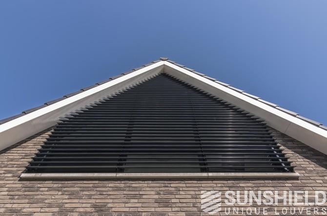Sunshield a installé un store sur mesure devant une fenêtre de chambre à coucher. La partie inférieure du système de persiennes est rectangulaire. Vers le faîte, la forme se transforme en triangle – les formes sont toujours distinctives.