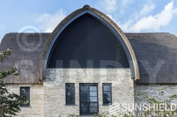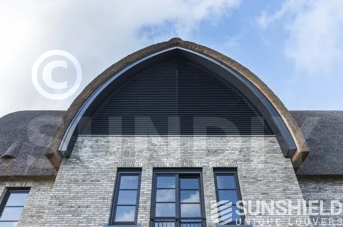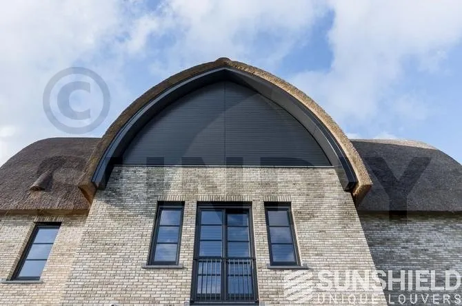 Pour cette protection solaire en forme d’arc, le choix s’est porté sur la persienne 96-E. Les pièces en aluminium sont revêtues de RAL 7021 – gris noir. Les pièces en plastique moulées par injection sont noires.