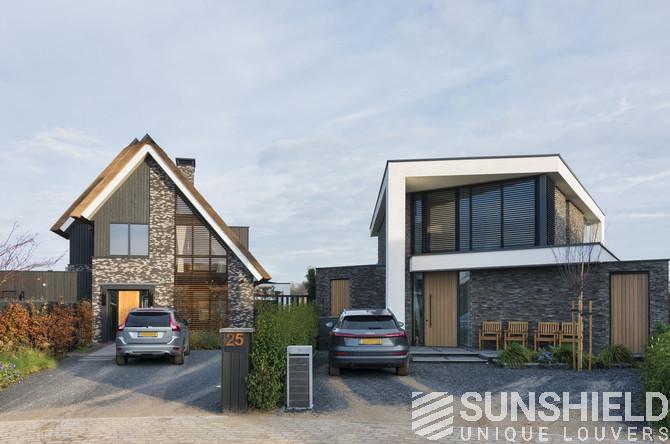 Une maison individuelle moderne à Blaricum est équipée de deux systèmes de persiennes disposés en angle. Un profilé d’angle fixe a été placé à l’angle où les deux systèmes se rencontrent.