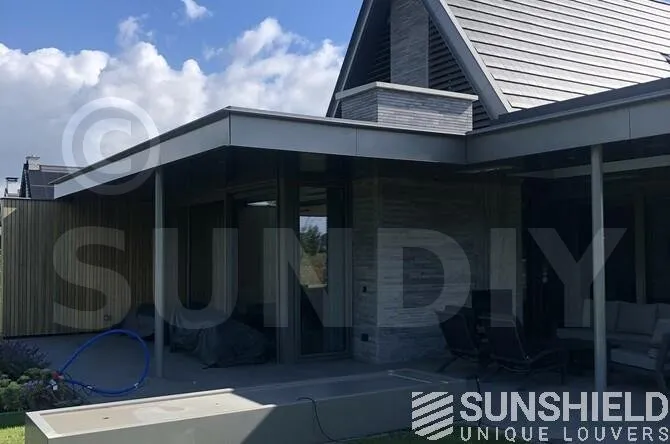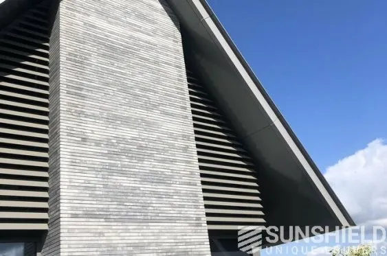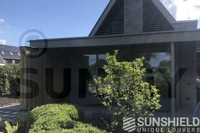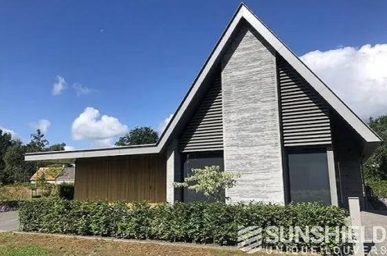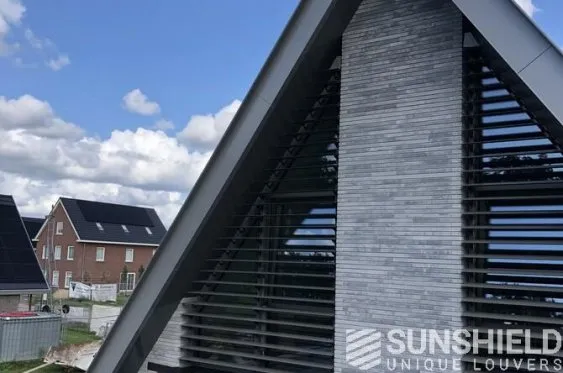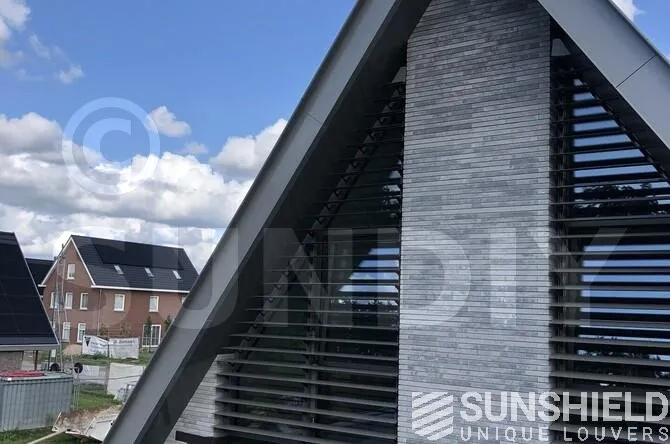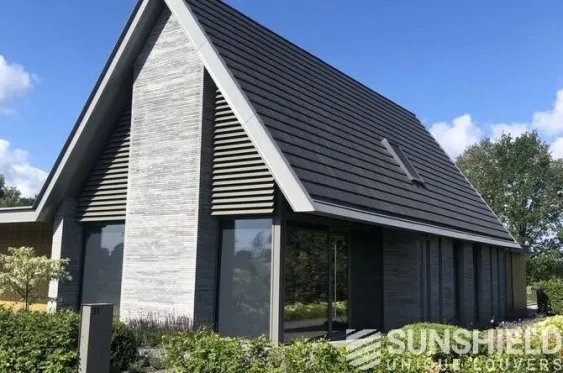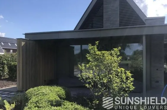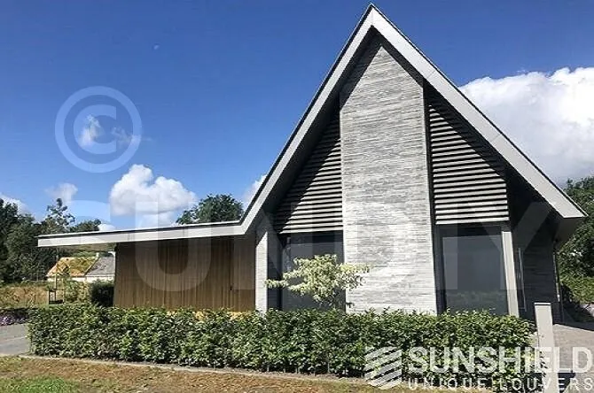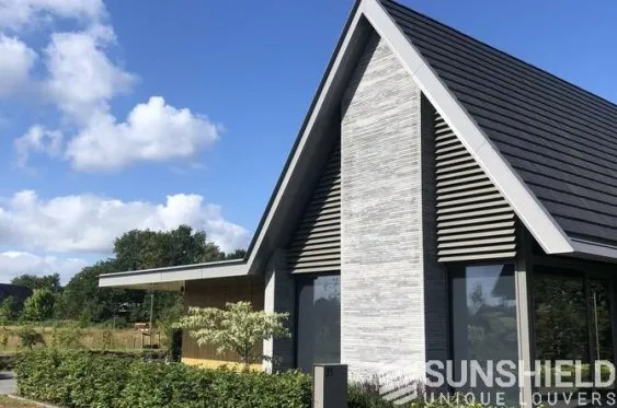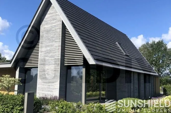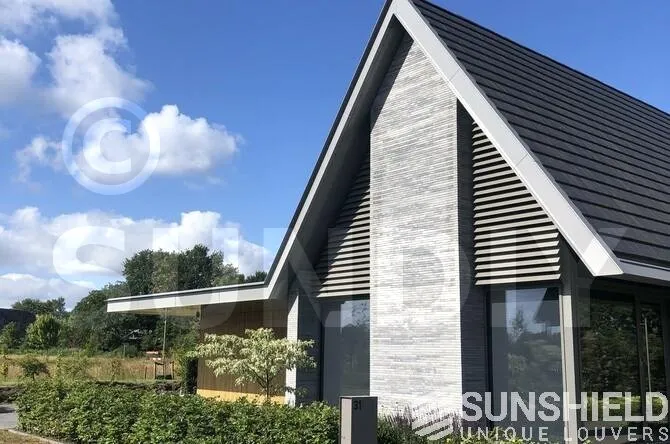 Ici, une maison individuelle a été équipée de persiennes uniques. Par Sunshield, en collaboration avec l’entrepreneur A&M Hersmis à Rijen. Les façades avant et arrière sont équipées de systèmes de lamelles.