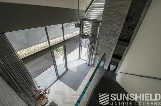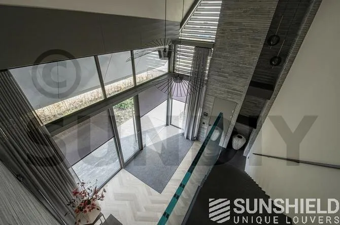 Les habitants ont choisi la persienne 150-E, d’une largeur de 150 mm. Si les persiennes sont entièrement ouvertes, la vue entre les lames est de 14 centimètres. Donc beaucoup de lumière du jour et une vue dégagée.