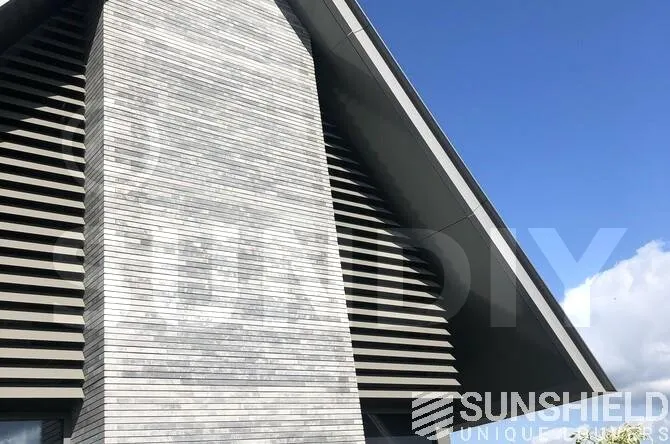 Les deux systèmes de persiennes de la façade arrière sont des images inversées l’une de l’autre. Ces systèmes de protection solaire ont également la forme d’un trapèze et changent de forme après 700 mm.