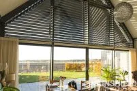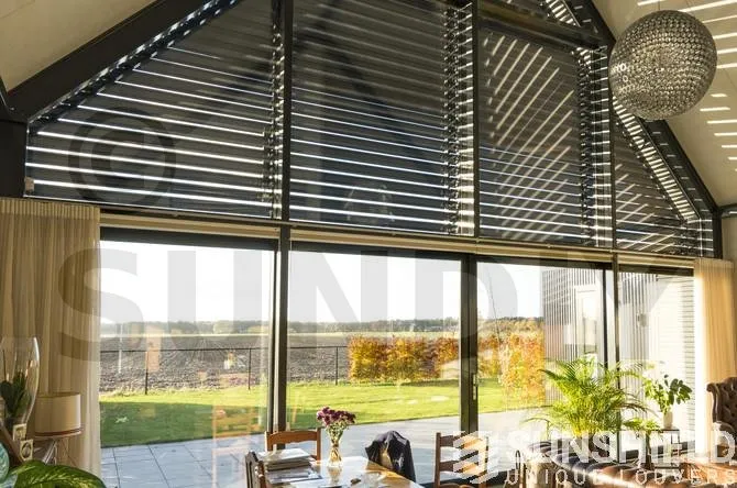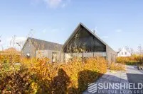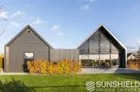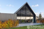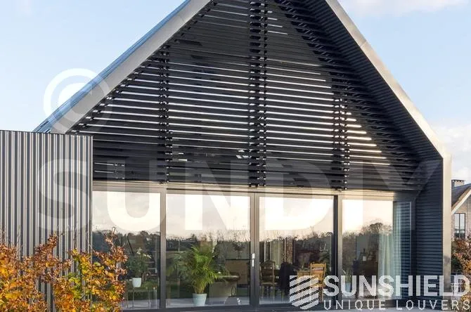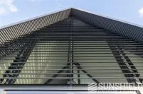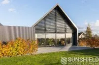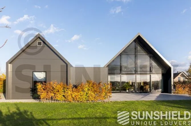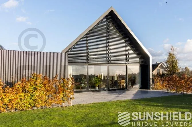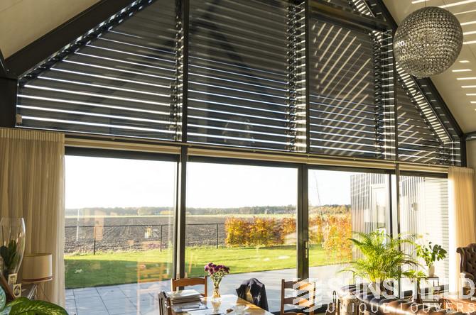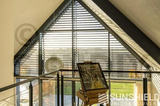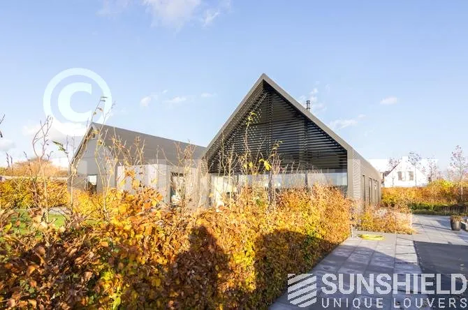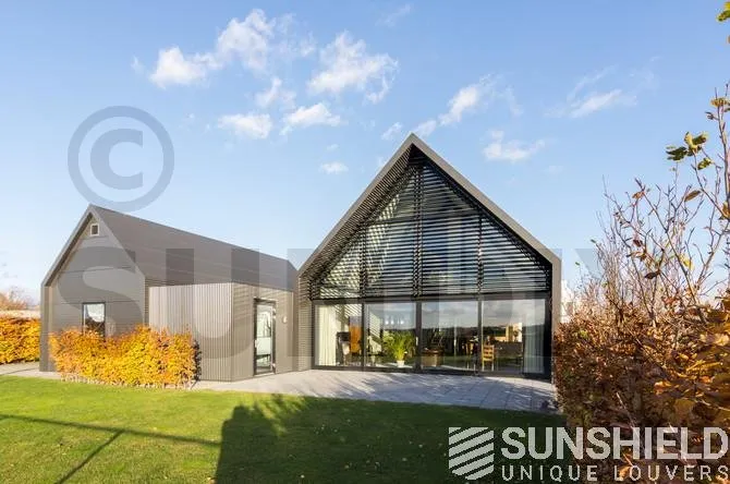 Le triangle au-dessus de la façade mesure plus de 22 m². Sunshield a équipé le triangle arrière de lames uniques. Les parties gauche et droite de ce store sont toutes deux équipées d’un moteur et peuvent être actionnées séparément.