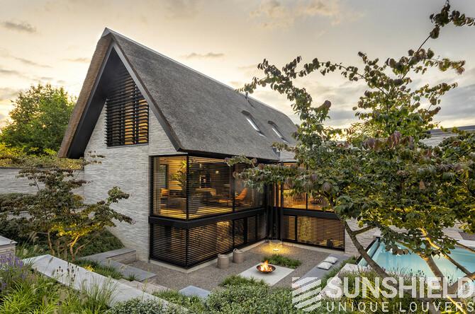 Découvrez une maison de campagne moderne équipée de multiples systèmes de persiennes de Sunshield, commandé par Geras Aannemersbedrijf à Diessen.