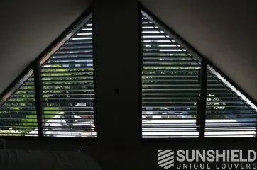 Les deux façades ont deux fenêtres dans une niche qui commence à la base comme un rectangle, mais se transforme rapidement en une forme triangulaire. Les systèmes de lattes suivent ces formes géométriques.