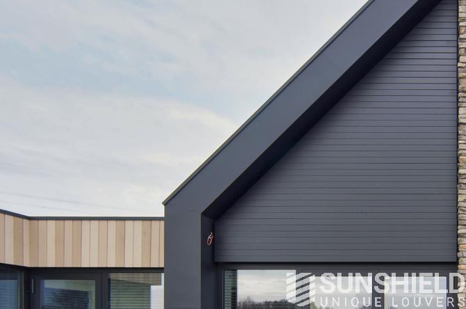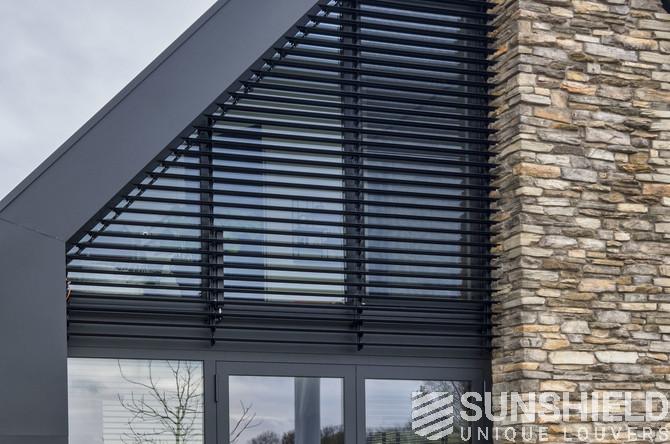 Sunshield a équipé cette maison individuelle de persiennes uniques. Un système de persiennes triangulaires a été placé pour la fenêtre côté rue et un autre devant la fenêtre arrière.