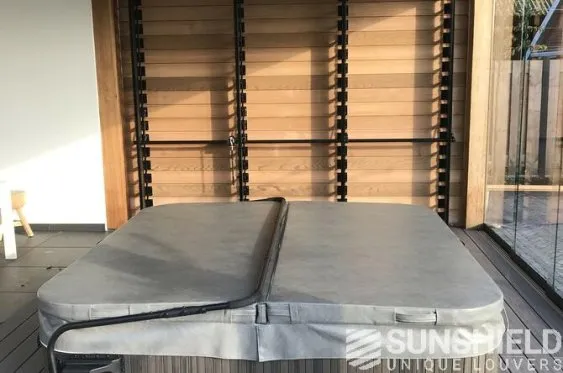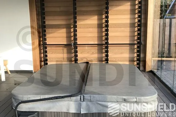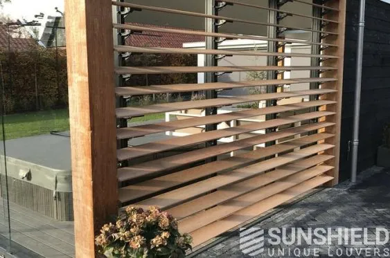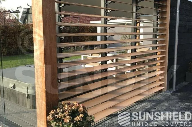 Cet auvent est équipé d’un mur à lames de Sunshield. Grâce à ce mur, les résidents peuvent choisir de rester à l’intérieur ou de s’abriter à l’extérieur sous le toit.