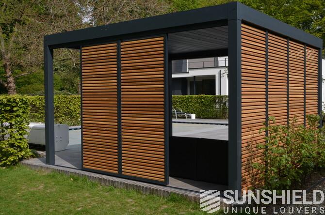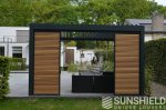 Tout d’abord, Sunshield a installé un toit à lames de 4 mètres sur 4. Ensuite, le mur arrière a été fermé par quatre panneaux fixes, tandis que deux panneaux coulissants ont été placés sur le mur court extérieur.