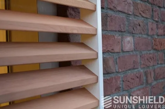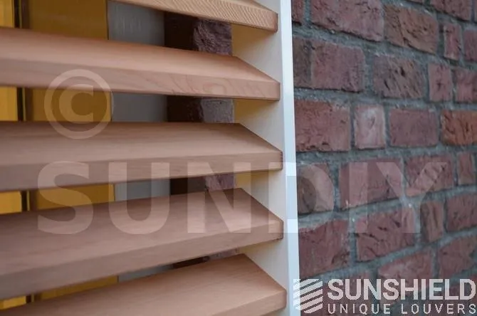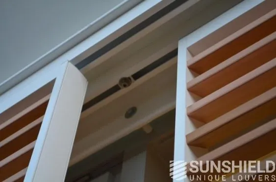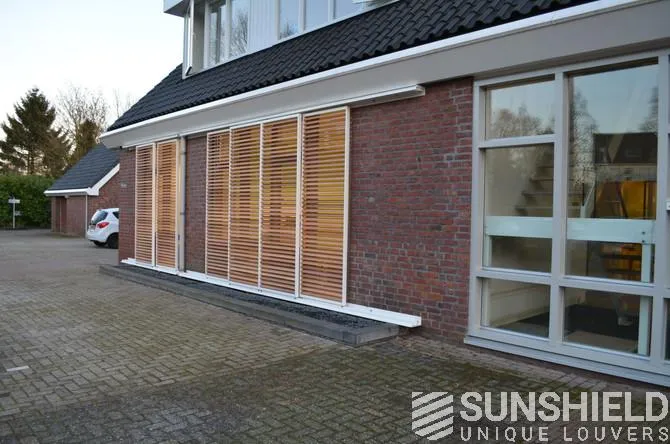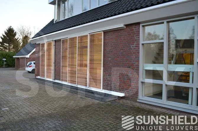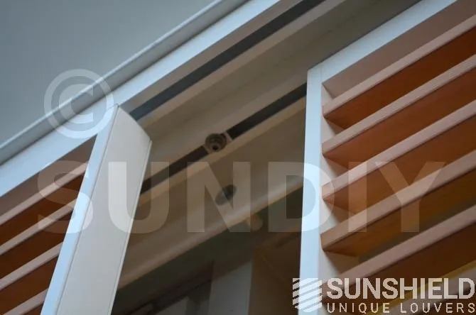 Avec la persienne en bois 68W, des stores coulissants sont installés ici. Un écran glissant se trouve devant une porte ou une pièce, dans une position inclinée. Un écran transparent sert de cloison avec de grandes persiennes, mais il est important de noter que cet écran peut se casser. Les portes restent facilement accessibles.