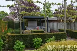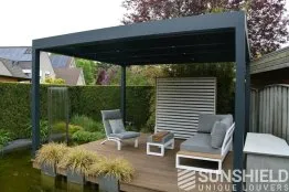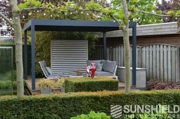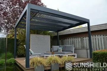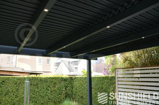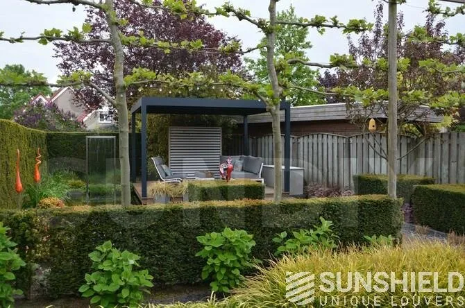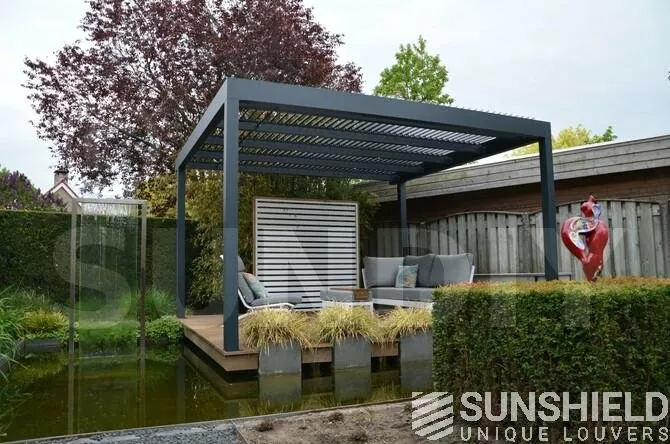 La terrasse et le toit à persiennes Nautilus sont installés sur une plateforme, entourée d’un plan d’eau et d’espaces verts aménagés.