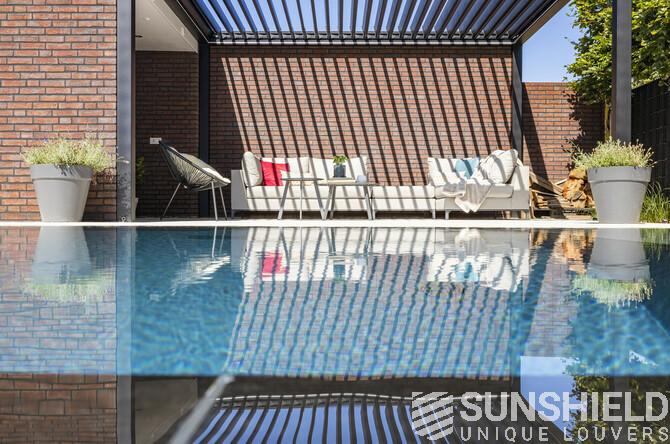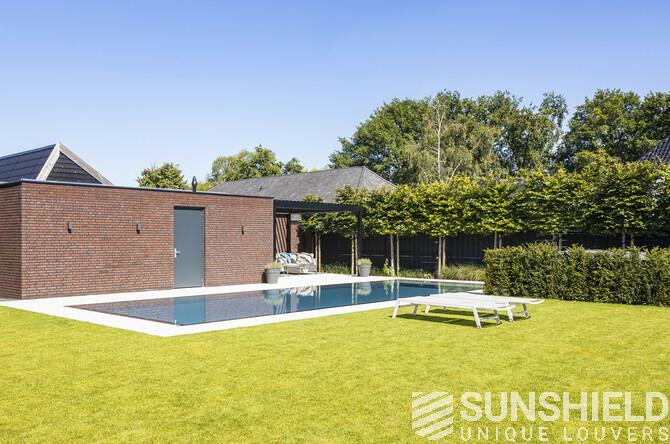 Voici une maison individuelle équipée d’un toit à lames, de la marque Sunshield. Les habitants ont opté pour le Quadro. Ce toit à lames doit son nom à son aspect robuste et cubiste.