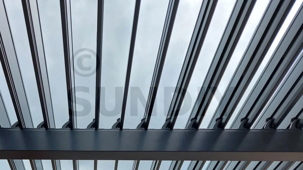 Avec le toit à persiennes Infinity, les persiennes 117-E sont positionnées verticalement, perpendiculairement au bâtiment. Ce toit à persiennes nécessite la pente habituelle de 1 cm par mètre courant. Lorsque cette chute est appliquée sur le toit à persiennes, il résiste à la pluie. Les persiennes peuvent être déplacées entre 0° et 90°. Le nom Infinity a été choisi car il n’y a pratiquement aucune limite à la longueur du toit à persiennes et il suffit de le soutenir tous les 4 m.