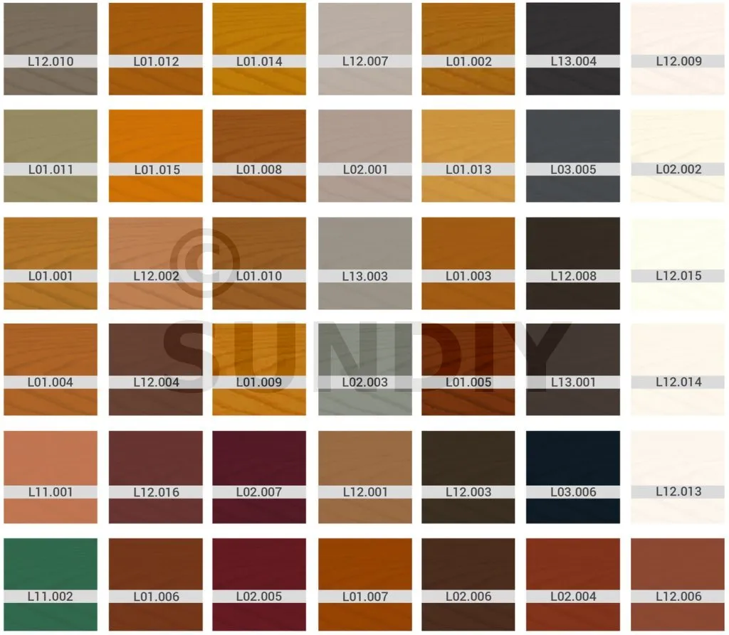 Le Western Red Cedar est un excellent choix pour les persiennes en bois. Il a un grain droit, est léger, stable et durable. Sunshield propose toutes sortes de couleurs et de traitements, également pour les lattes de bois. Les composants en aluminium peuvent être fournis dans n’importe quelle couleur RAL. Il est même possible d’avoir des persiennes, des bras de crémaillère et des composants en plastique de couleurs distinctives pour obtenir des impressions architecturales sophistiquées. Des couleurs et des structures sur mesure sont possibles sur demande. Ci-après un aperçu des couleurs les plus courantes pour la persienne de 68-W :