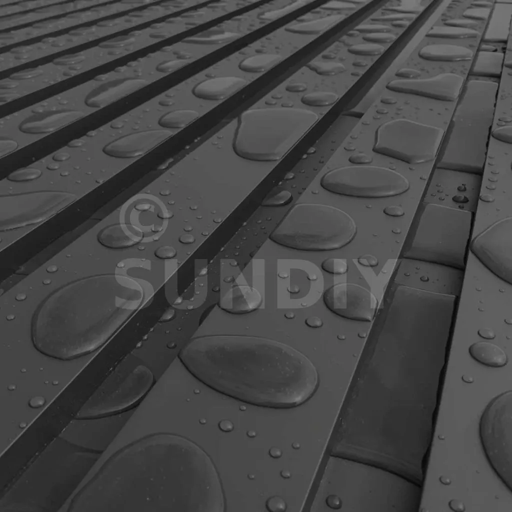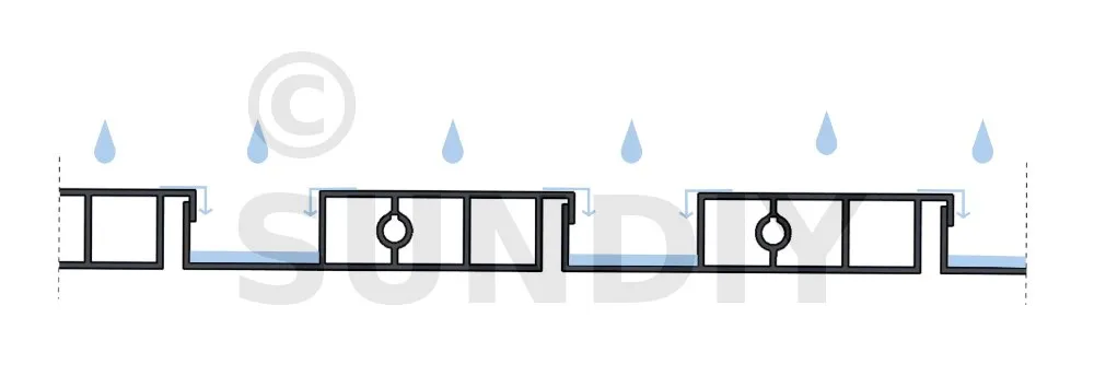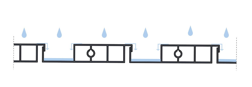 L’eau est collectée dans la rigole intégrée à la lame. Sous l’effet de la gravité, elle s’écoule ensuite de part et d’autre à chaque extrémité de la lame. Si vous recherchez une étanchéité totale, nous vous conseillons d’ajouter des chenaux qui viendront récupérer l’eau à chaque extrémité et la rediriger vers l’extérieur.