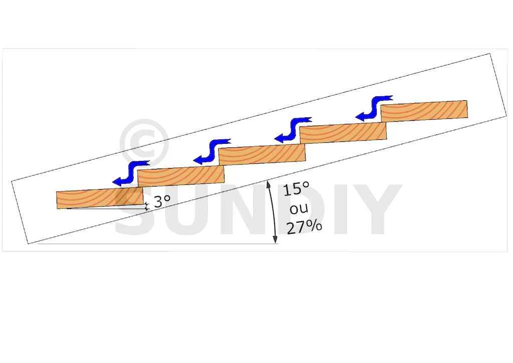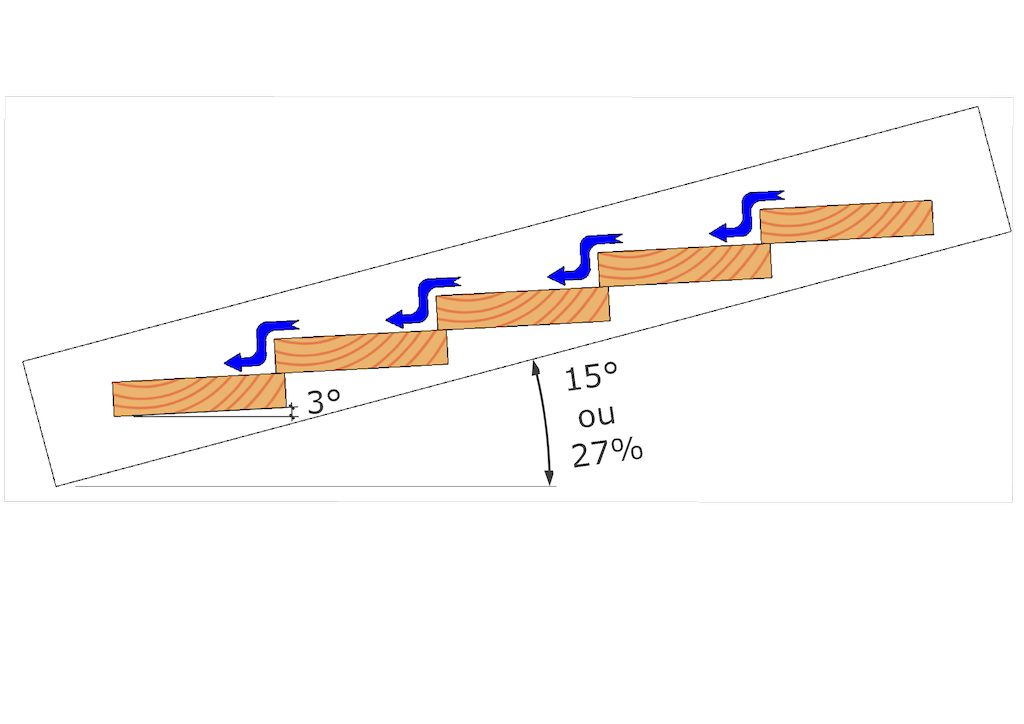 Bien qu’elles n’ont pas de gouttière, elles peuvent se révéler étanche selon la pente de la toiture. Pour illustrer cela voici des schémas qui montre le degrés de pente à respecter et la disposition des lames pour que vos lames en bois ne laisse plus passer l’eau.
